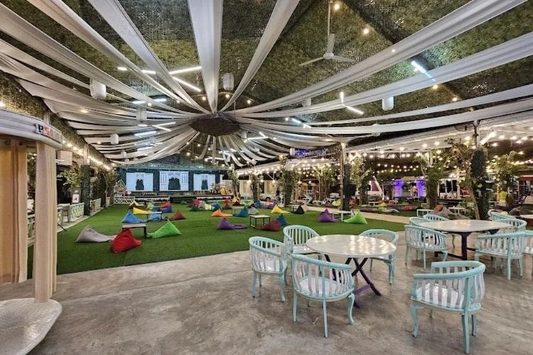Sore hingga malam hari pas untuk ngobrol santai sambil menikmati minuman manis. Sofa cantik dengan lampu gantung artistik menjadi spot foto favorit