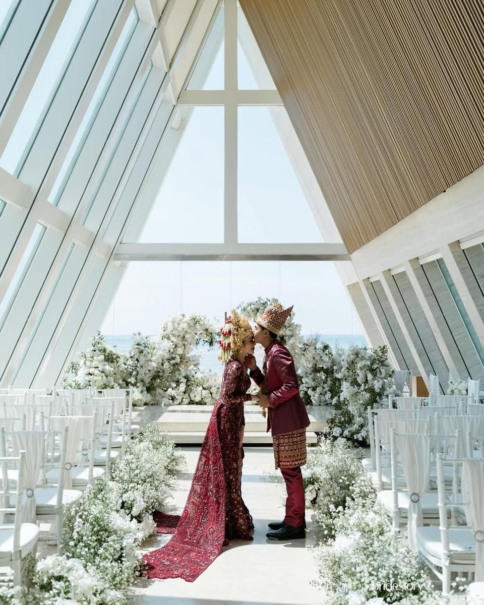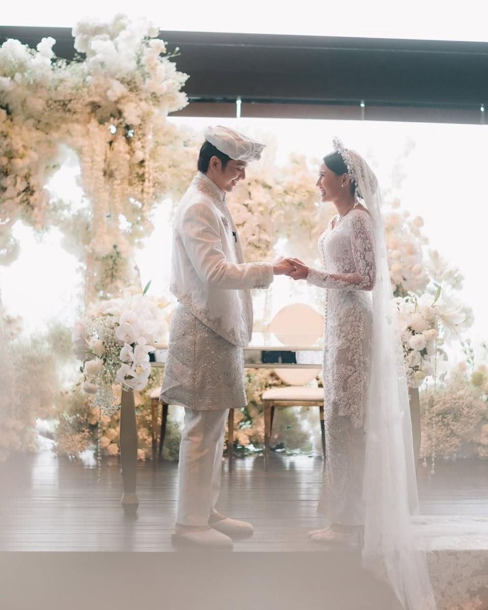 Dengan latar keindahan lanskap pantai Bali yang memesona, prosesi akad nikah Angga Yunanda dan Shenina tampil begitu elegan dengan konsep white wedding.