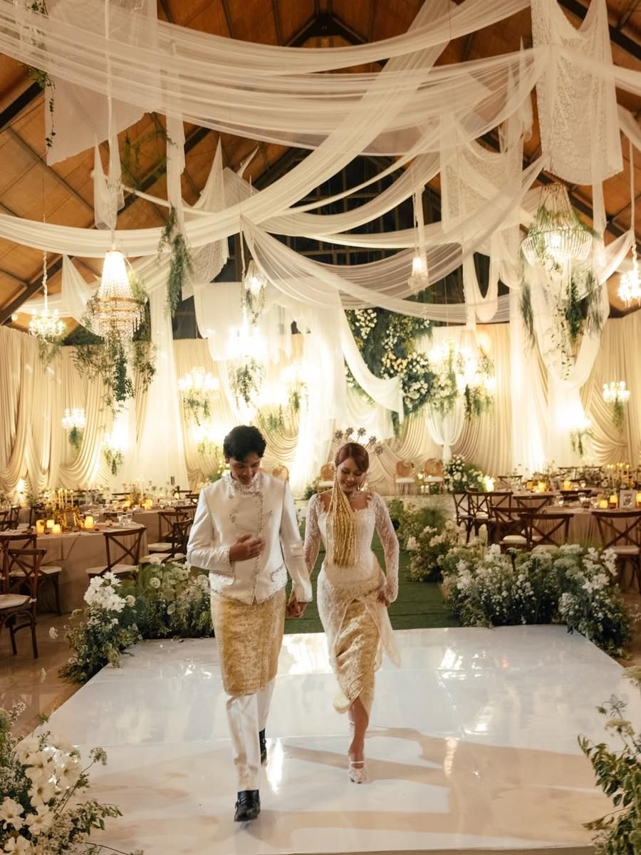 Keindahan dekorasi semakin terasa lewat instalasi draperi yang megah dan tertata apik. Tak hanya menghiasi area latar, draperi juga membentang di bagian langit-langit dengan rangkaian asimetris yang memukau, menciptakan suasana akad dramatis sekaligus memanjakan mata.