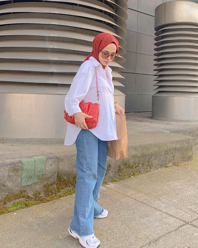OOTD baju putih celana jeans hijab selanjutnya cukup kasual dengan atasan kemeja putih oversize dan bawahan baggy jeans. Perpaduan kedua fashion item tersebut cocok dipakai untuk pergi ke mana saja dengan dilengkapi aksesori lainnya.