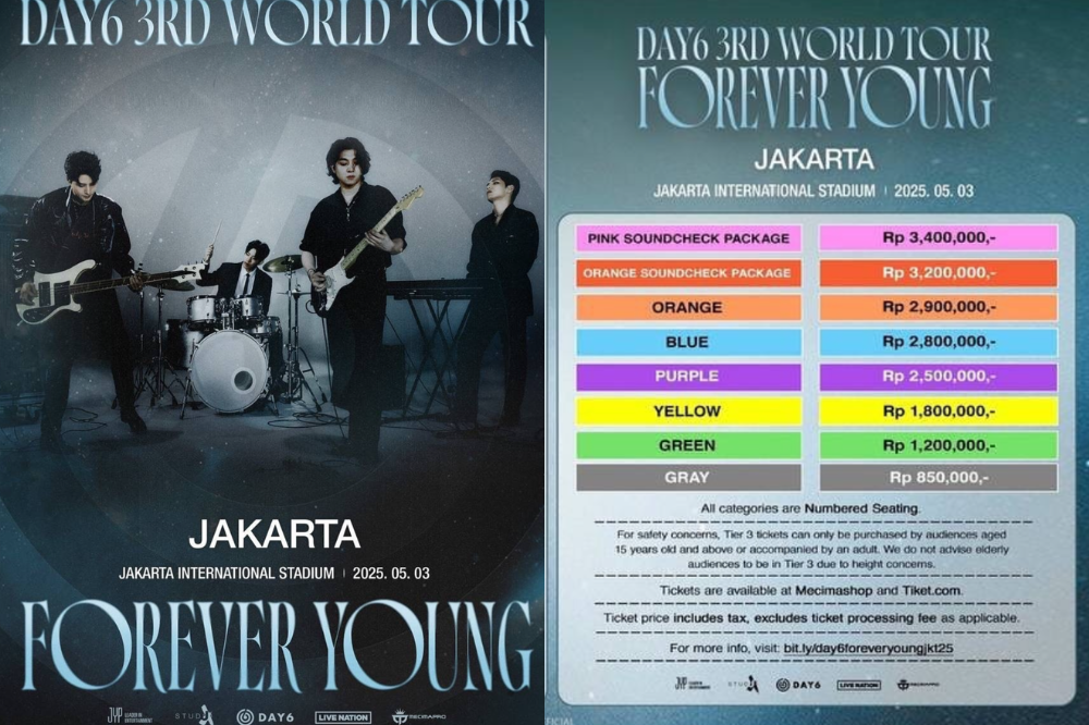 Band DAY6 juga kembali mengadakan tur dunia bertajuk ‘Forever Young’ di Jakarta pada 3 Mei 2025 setelah sebelumnya sukses digelar di Jakarta, Surabaya, dan Bali. Tur ini sempat digadang-gadang menjadi konser stadion pertama band tersebut, namun terjadi perubahan lokasi hingga menimbulkan kekecewaan para MyDay (sebutan fans DAY6).