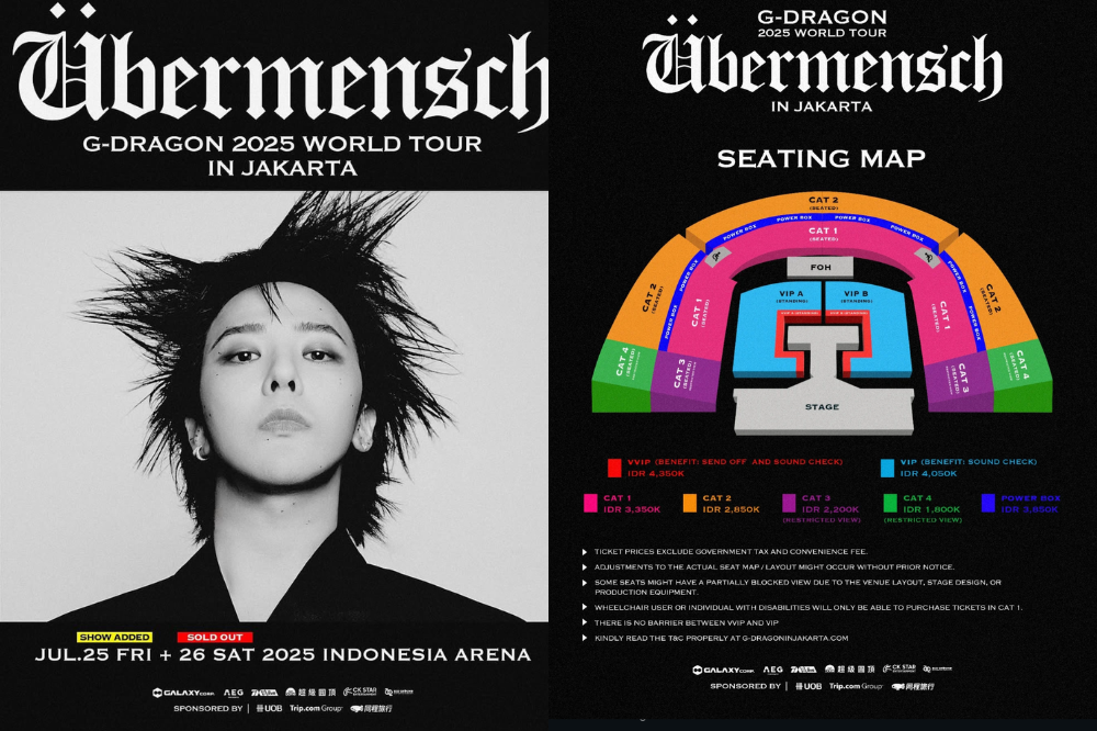 Solois G-Dragon juga datang ke Indonesia tahun ini untuk mengobati rasa rindu para penggemar setelah terakhir kali mengadakan konser di Jakarta pada 2017 silam. Dengan tur dunia bertajuk ‘Ubermensch’, penyanyi yang disapa GD itu mengadakan konser dua hari berturu-turut di Indonesia Arena Jakarta pada 25 – 26 Juli 2025.