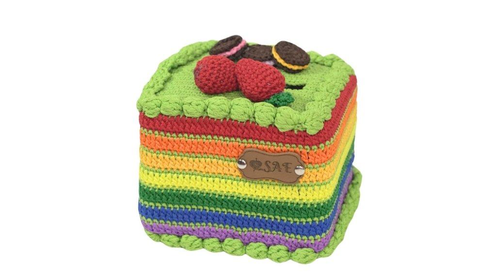 Dibuat dari benang polyester berkualitas tinggi, kotak tisu ini memiliki desain unik berbentuk Rainbow Cake yang ceria dan menarik.