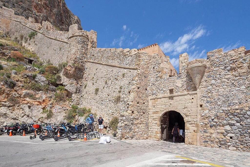 Monemvasia berasal dari dua kata Yunani, yaitu moni artinya satu, dan emvasia berarti pintu masuk. Menurut laman resmi Visit Greece, kota ini benar-benar hanya bisa dimasuki lewat satu gerbang sempit yang terletak di kaki tebing. Hal tersebut sengaja dibuat untuk alasan pertahanan.