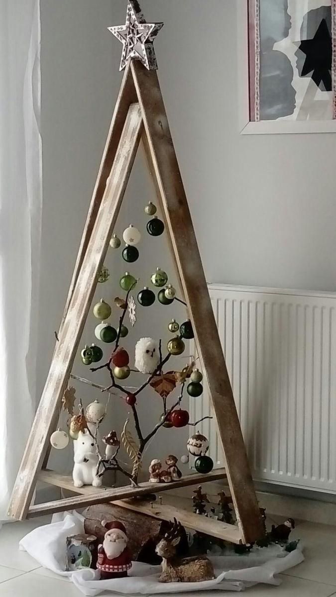 Jika kamu tidak ingin repot, pohon Natal dari kayu ini bisa jadi inspirasi. Cukup bentuk kayu menjadi dua segitiga dengan ukuran besar dan kecil. Letakkan segitiga kayu kecil di dalam segitiga yang besar dengan posisi miring. Tambahkan potongan kayu besar di bagian bawah sebagai penyangga. Akhirnya, hiasi dengan manekin dan ornamen khas Natal.