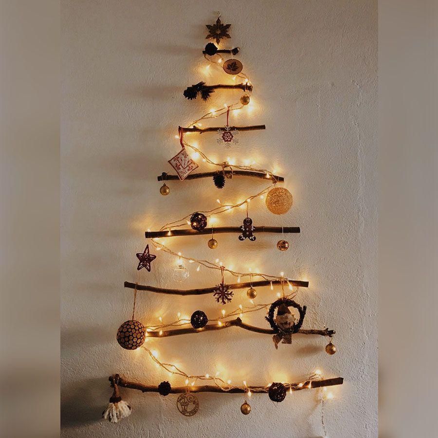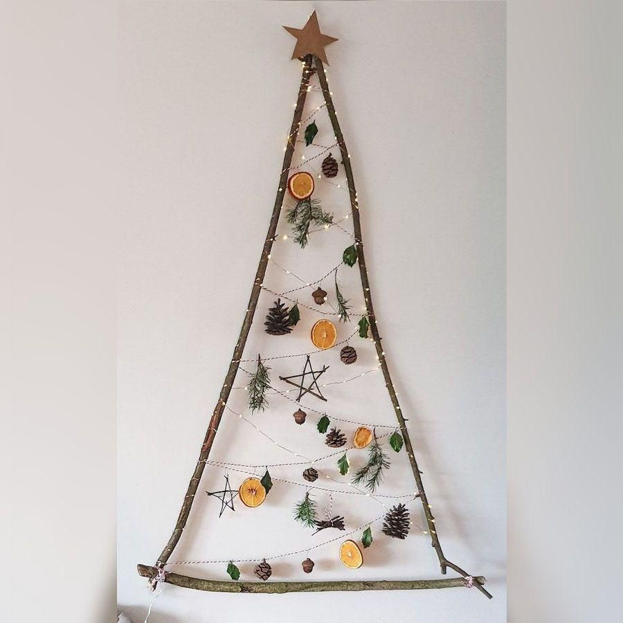 Kini, pohon Natal tidak harus menjadi pajangan utama di ruang tamu. Kamu bisa menyulapnya menjadi hiasan di dinding. Caranya, siapkan dua batang kayu panjang dan satu batang kayu pendek. Bentuk ketiga batang kayu tersebut menjadi segitiga sama kaki. Ikat antar sudut segitiga kayu tersebut dengan tali. Tambahkan aneka ornamen Natal agar tampilan semakin menarik.