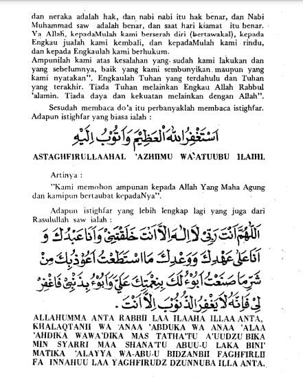 Artinya: “Artinya, “Ya Allah, Tuhan kami, segala puji bagi-Mu, Engkau penegak langit, bumi, dan makhluk di dalamnya. Segala puji bagi-Mu, Engkau penguasa langit, bumi, dan makhluk di dalamnya. Segala puji bagi-Mu, Engkau cahaya langit, bumi, dan makhluk di dalamnya. Segala puji bagi-Mu, Engkau Maha Benar. Janji-Mu benar. Pertemuan dengan-Mu kelak itu benar. Firman-Mu benar adanya. Surga itu nyata. Neraka pun demikian. Para nabi itu benar. Demikian pula Nabi Muhammad SAW itu benar. Hari Kiamat itu benar. Ya Tuhanku, hanya kepada-Mu aku berserah. Hanya kepada-Mu juga aku beriman. Kepada-Mu aku pasrah. Hanya kepada-Mu aku kembali. Karena-Mu aku rela bertikai. Hanya pada-Mu dasar putusanku. Karenanya ampuni dosaku yang telah lalu dan yang terkemudian, dosa yang kusembunyikan dan yang kunyatakan, dan dosa lain yang lebih Kau ketahui ketimbang aku. Engkau Yang Maha Terdahulu dan Engkau Yang Maha Terkemudian. Tiada Tuhan selain Engkau. Tiada daya upaya dan kekuatan selain pertolongan Allah.” (HR. Muslim, Ibnu Majah, dan Ahmad)