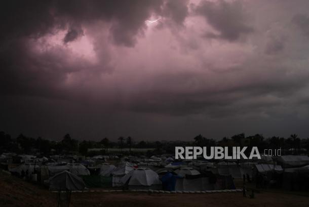 Badai petir tampak di atas tenda kamp pengungsi Palestina di Zawaida, Tengah Jalur Gaza, Rabu, 10 Desember 2025. – ( AP Photo/Abdel Kareem Hana)