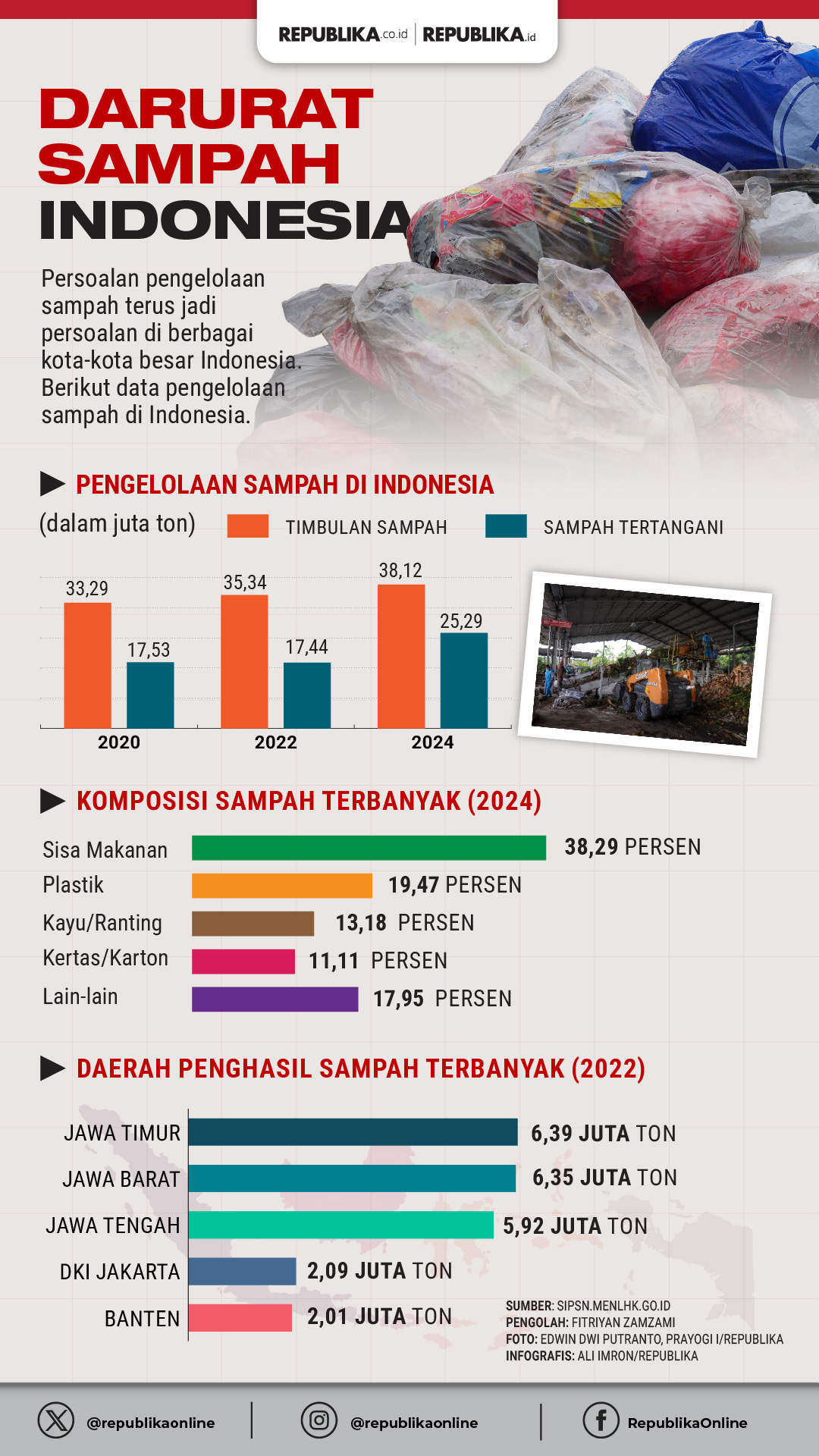 Data Sistem Informasi Pengelolaan Sampah Nasional (SIPSN) Kementerian Lingkungan Hidup mengungkap dari 343 kabupaten/kota se Indonesia pada 2024, timbulan sampah mencapai 38,2 juta ton dan baru 34,74 persen yang terkelola.