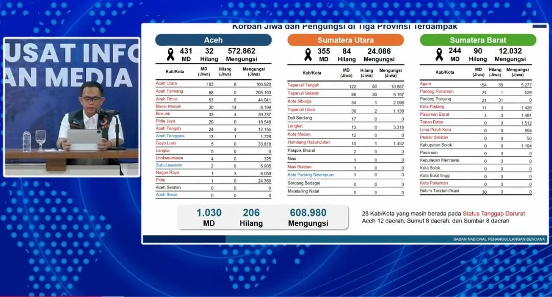 Sementara itu, jumlah korban jiwa yang meninggal akibat banjir di Sumatra hingga hari Selasa kemarin telah mencapai 1.053 orang.