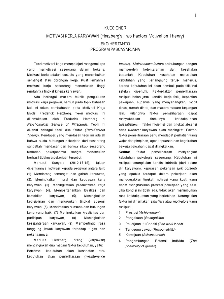 Untuk membuat kuesioner yang efektif, penting untuk memastikan bahwa pertanyaan mencakup berbagai aspek seperti motivator intrinsik dan ekstrinsik, kepuasan kerja, pengembangan karier, manajemen, serta budaya organisasi. Misalnya, pertanyaan tentang motivator intrinsik bisa berkaitan dengan rasa tanggung jawab, otonomi, atau kesempatan belajar. Sementara itu, pertanyaan tentang motivator ekstrinsik bisa fokus pada gaji, tunjangan, dan keseimbangan kerja-kehidupan.