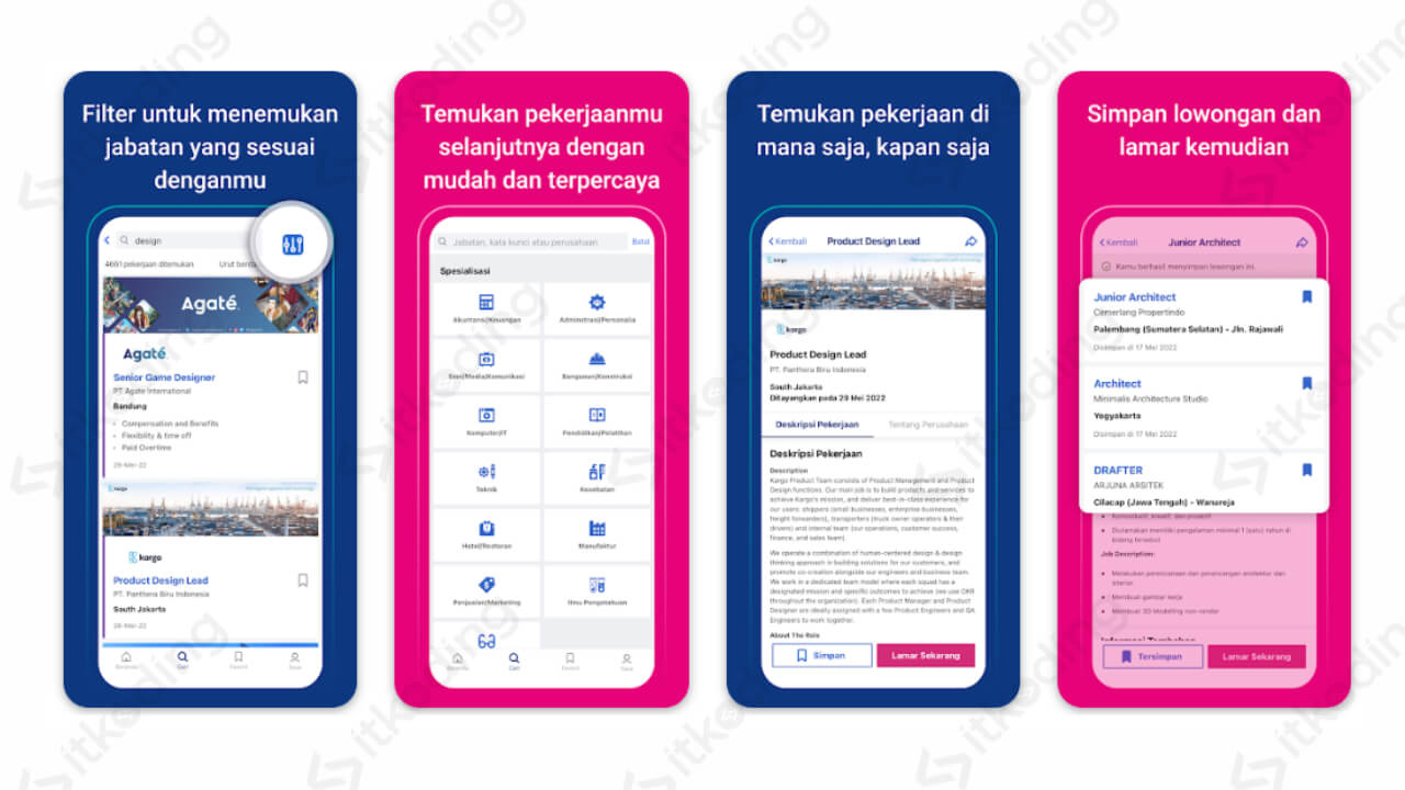 KitaLulus adalah aplikasi pencari kerja yang cocok untuk fresh graduate maupun profesional yang ingin mencari peluang baru. Aplikasi ini menyediakan berbagai lowongan kerja dari berbagai industri, termasuk posisi entry-level hingga tingkat manajerial. Selain itu, KitaLulus juga memiliki forum Komunitas Pejuang Kerja, tempat para pencari kerja bisa berdiskusi, berbagi pengalaman, dan mendapatkan tips seputar dunia kerja.