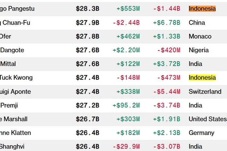 - Mukesh Ambani dari India mempertahankan posisi puncak dengan kekayaan Rp 1.551 triliun