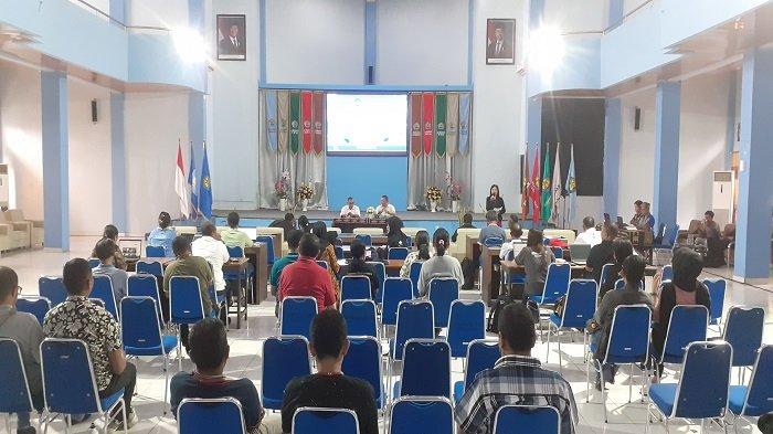 Mengenakan jas batik yang melambangkan identitas lokal, ia didampingi Wakil Direktur Bidang Akademik, Max Arthur Julian Supit, S.Pt., GDIpC., MFoodTech dan host Jurnalis Pos Kupang, Annie Toda.