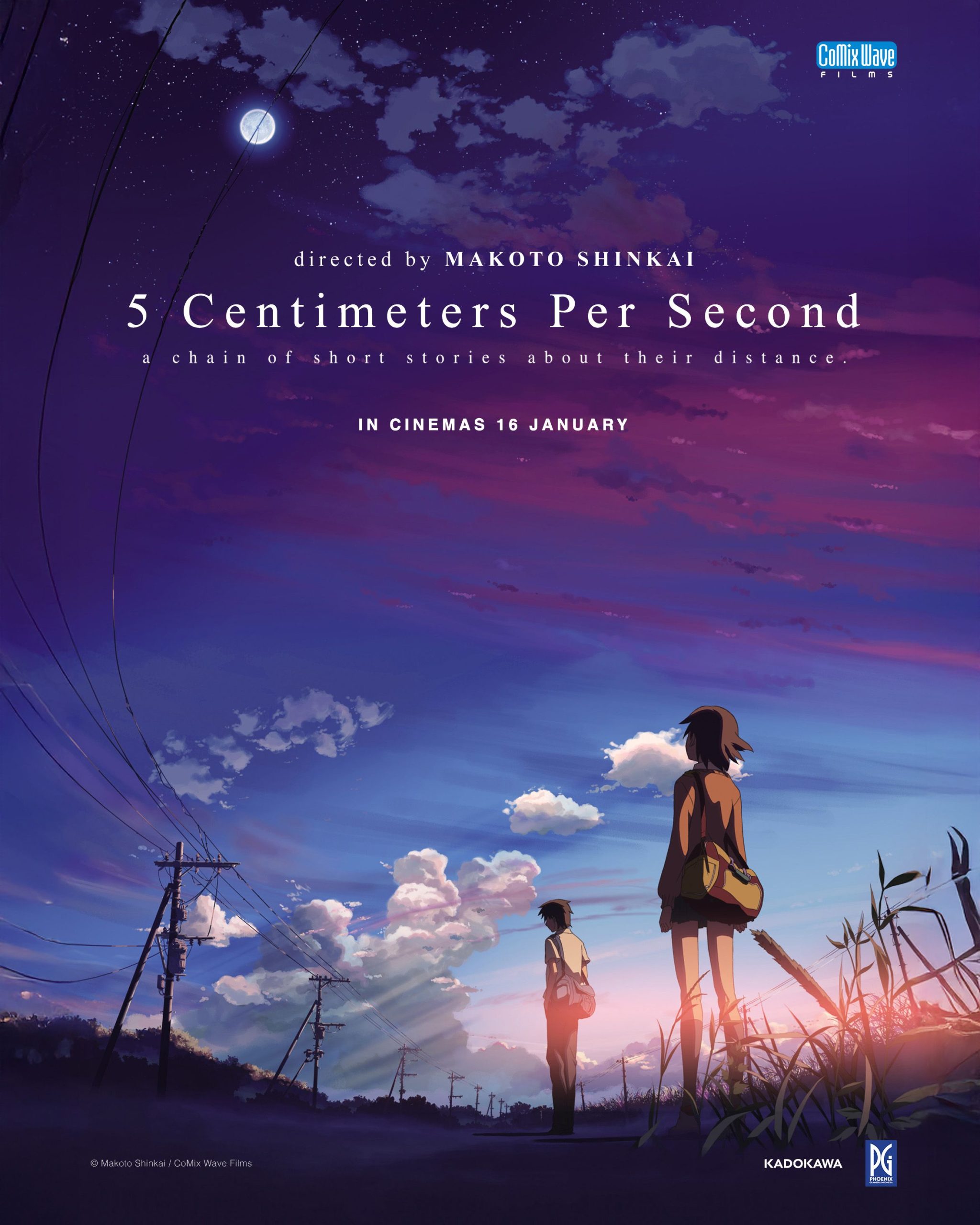 Setelah 18 tahun sejak perilisan perdananya, film animasi legendaris karya sutradara Makoto Shinkai, 5 Centimeters Per Second (2007), akhirnya akan tayang di jaringan bioskop Indonesia mulai 16 Januari 2026. Para penggemar Makoto Shinkai dan pencinta animasi kini bisa merasakan pengalaman menonton animasi legendaris 5 Centimeters Per Second di layar lebar. Sebelum rilis reguler, juga akan ada special screening pada 10 dan 11 Januari 2026.
