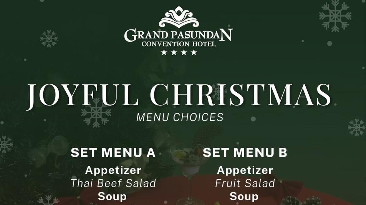 Grand Pasundan Convention Hotel Bandung di Jalan Peta No.147–149, Bojongloa Kaler, menghadirkan promo makan malam Natal bertajuk “Joyful Christmas”. Acara ini digelar pada Rabu, 24 Desember 2025, pukul 19.00–22.00 WIB di Executive Lounge lantai 11. Tamu dapat memilih antara Set Menu A atau Set Menu B, dengan hidangan mulai dari salad, sup hangat, steak atau chicken cordon bleu, hingga dessert. Harga yang ditawarkan relatif terjangkau, yakni Rp 180.000 nett per orang, menjadikannya pilihan menarik untuk perayaan Natal yang lebih santai. -