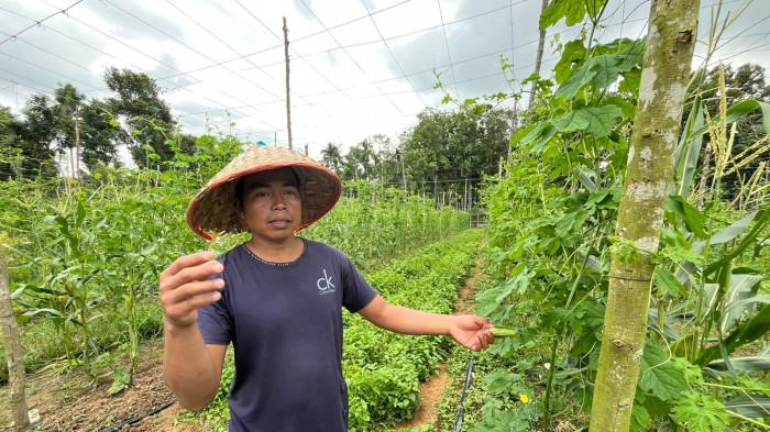 Sanubi memilih tanaman pare sebagai komoditas utama, dan jagung dengan sistem tumpang sari di sela-selanya. “Jagung ini tempat lewat waktu panen pare,” ujarnya sambil menunjuk jalur-jalur di antara barisan tanaman.