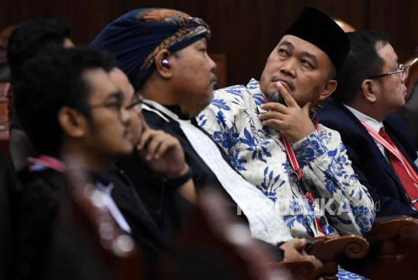 Koordinator Masyarakat Antikorupsi Indonesia (MAKI) Boyamin Saiman (kedua kanan) mengikuti sidang pembacaan putusan Pengujian Materiil Undang-Undang Nomor 30 Tahun 2002 tentang Komisi Pemberantasan Tindak Pidana Korupsi di Gedung MK, Jakarta, Selasa (15/8/2023). – (Antara/Sigid Kurniawan)