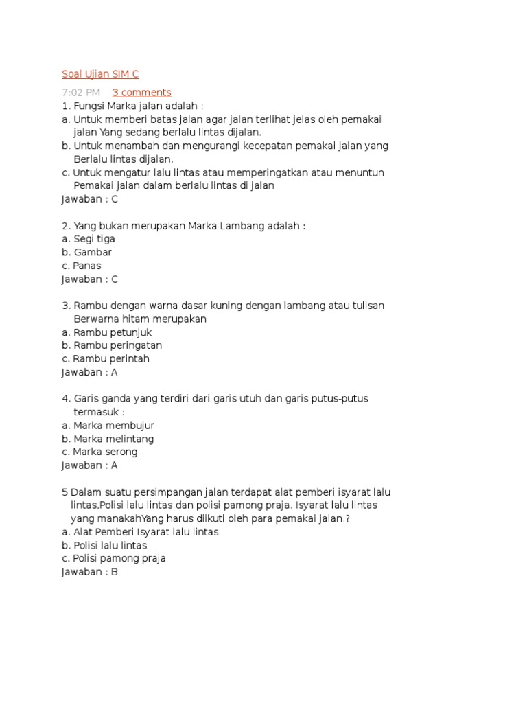 Berikut ini adalah ringkasan 25 soal ujian SIM C beserta jawabannya yang sering muncul dalam ujian resmi kepolisian.