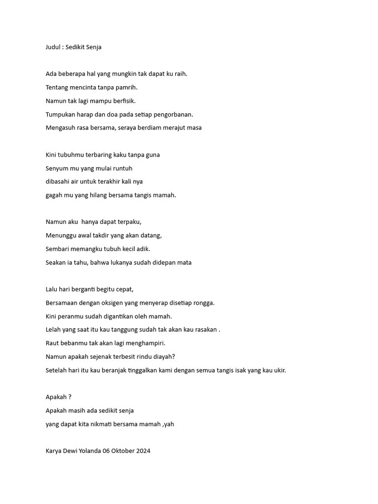 Karya sastra sering kali menjadi cerminan perasaan, pikiran, dan pengalaman manusia. Salah satu karya yang menarik untuk dibahas adalah “Pulang Menjemput Senja” karya Sitti Chandra. Meskipun judulnya mirip dengan buku “Pulang” karya Tere Liye, karya ini memiliki makna dan pesan yang unik serta berbeda. Dalam puisi ini, Sitti Chandra menggambarkan perjalanan batin seseorang yang sedang mencari makna dari kehidupan, terutama dalam konteks cinta, kehilangan, dan harapan.