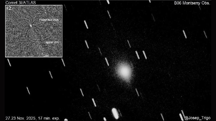 Gambar yang direkam pada 26 November dari puncak Gunung Mauna Kea memperlihatkan komet 3I/ATLAS berada dalam salah satu fase paling aktif sejauh ini. Pemanasan akibat radiasi Matahari menyebabkan es di dalam komet menyublim dan menyembur ke angkasa bersama debu dalam jumlah besar, membentuk koma terang di sekitar inti komet serta ekor panjang yang bercahaya.