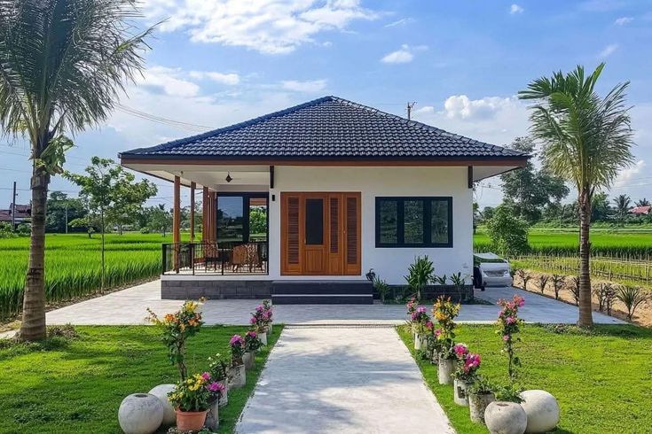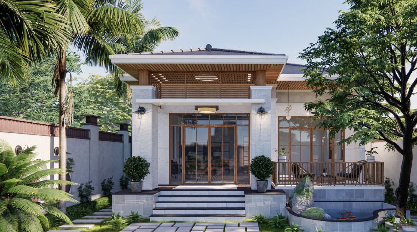 Rumah satu lantai dengan atap limas ini memiliki ketinggian bangunan sedikit di atas level jalan membuat area masuknya dilengkapi dengan tangga untuk mencapai ruang dalam. Teras rumah ini ditempatkan di sisi kanan fasad dan dipisahkan cukup jauh dari garasi, sehingga suasananya lebih tenang dan tidak terganggu aktivitas keluar masuk kendaraan.