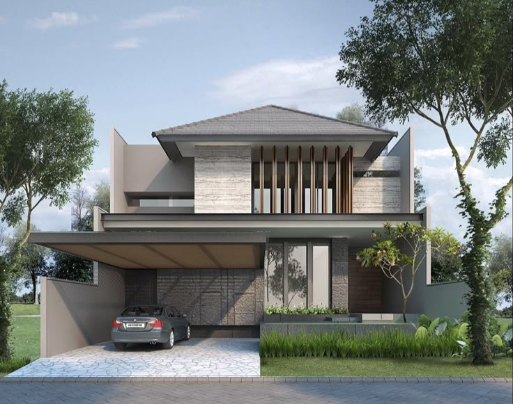 Teras pada rumah dua lantai beratap limas ini ditempatkan tepat di depan area masuk dan dirancang sebagai ruang transisi yang terasa menyatu dengan fasad utama. Elevasinya dibuat sedikit lebih tinggi dari carport sehingga pintu masuk terlihat lebih tegas dan berkarakter. Penataan planter yang memanjang, membingkai teras dan menyamarkan perbedaan ketinggian lantai. Nuanda modern tropis pada hunian ini juga terlohat berkat kehadiran material kayu dan jendela berukuran besar pada bagian fasad.