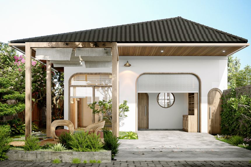 Pada rumah ini, bidang atap limas dibuat memanjang hingga ke sisi paling depan sehingga bagian tersebut otomatis menjadi atap tambahan untuk teras. Area teras hanya mengambil setengah dari keseluruhan lebar fasad, sehingga komposisinya terasa seimbang tanpa menutupi fungsi ruang di sebelah kanan. Pilar kayu di sisi kiri dipasang sebagai penanda sekaligus pembingkai ruang duduk, memberi batas visual yang rapi antara teras dan taman di sekitarnya.