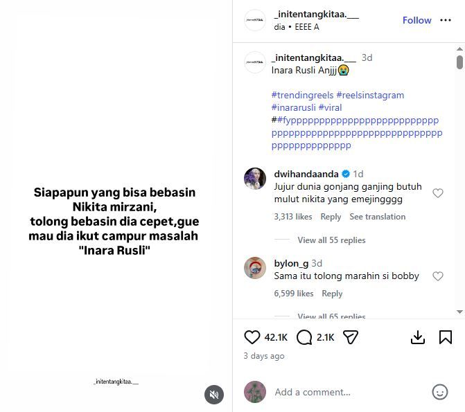 Pemilik akun mengakui ingin melihat Nikita Mirzani turut campur dalam kasus Inara Rusli. Seperti diketahui, kasus Inara Rusli saat ini memang menjadi topik yang banyak dibicarakan.