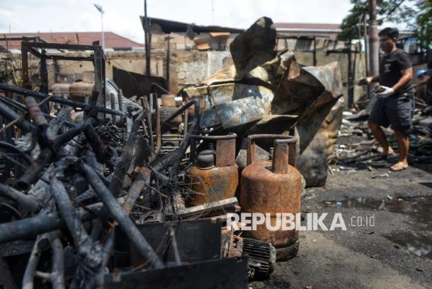 Pedagang membersihkan puing-puing sisa kebakaran di kiosnya pascakericuhan di kawasan Kalibata, Jakarta, Jumat (12/12/2025). Pasca kejadian tersebut, kondisi di lokasi berangsur kondusif. Setidaknya sembilan kios, enam kendaraan roda dua, dan satu kendaraan roda empat dibakar. Kericuhan ini dipicu oleh pengeroyokan terhadap penagih utang lapangan (debt collector) yang dipukuli orang tidak dikenal hingga tewas.