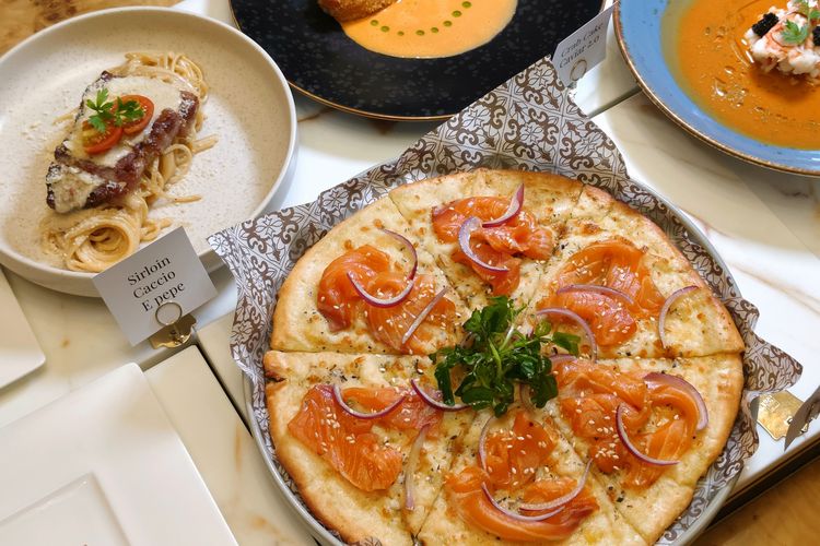 Pizza tipis, ringan, dan renyah khas Italia ini tampak sederhana pada pandangan pertama karena disajikan dengan potongan salmon. Namun, saat gigitan pertama menyentuh lidah, aroma asapnya langsung mengisi mulut.