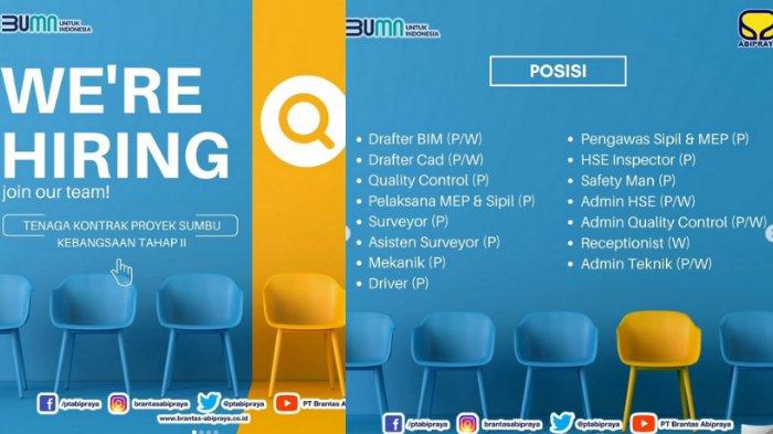 Dalam rangka memenuhi kebutuhan pegawai sesuai Rencana Kerja dan Anggaran Perusahaan (RKAP) dan Rencana Jangka Panjang Perusahaan (RJPP), Panitia Seleksi Penerimaan Pegawai PT Brantas Abipraya (Persero) membuka kesempatan untuk putra-putri terbaik bangsa agar dapat berperan serta aktif dalam pembangunan Indonesia dengan bergabung bersama kami, untuk menduduki posisi berikut: