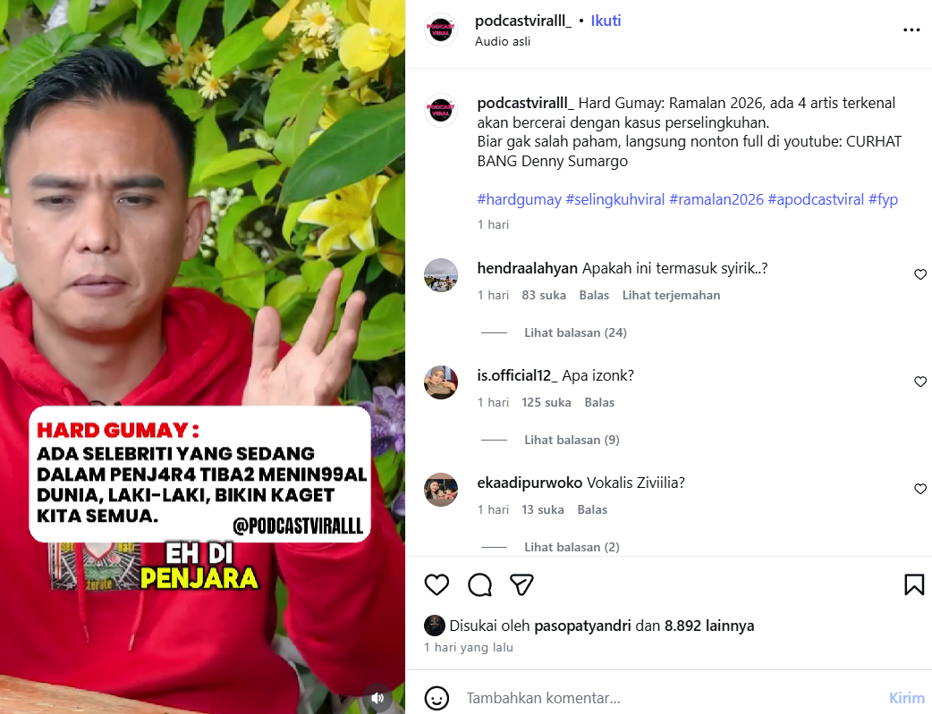 Ramalan Hard Gumay itu ditayangkan ulang di akun Instagram @podcastviralll_. Dalam perbincangan tersebut, Hard Gumay memaparkan salah satu penglihatannya yang dinilai paling mengejutkan, yakni mengenai seorang aktor terkenal yang disebut-sebut akan meninggal dunia ketika sedang menjalani masa hukuman di balik jeruji besi.