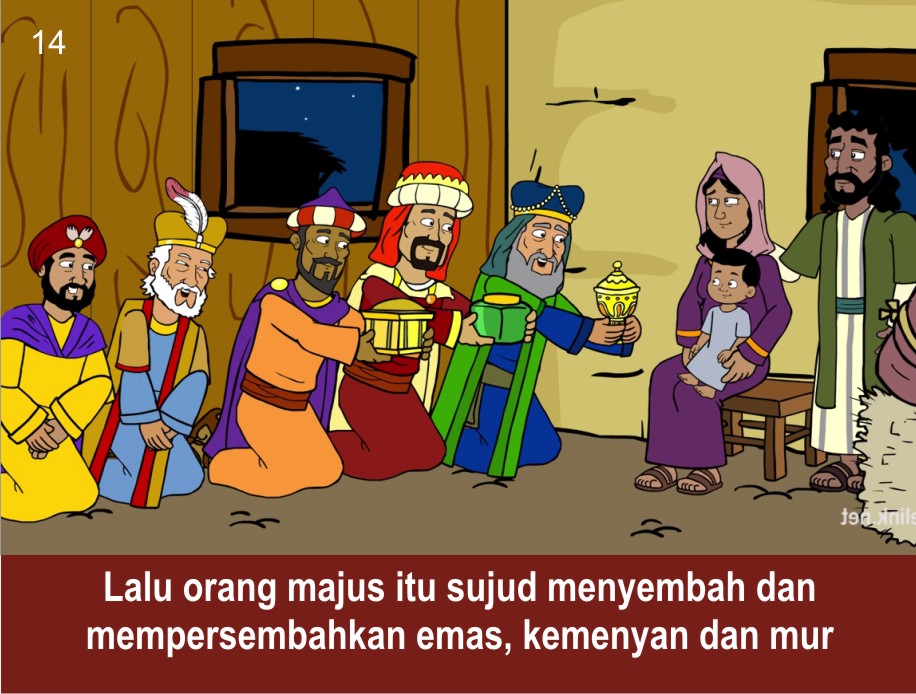 Maka masuklah mereka ke dalam rumah itu, dan melihat Anak itu bersama Maria, ibu-Nya. Lalu mereka sujud menyembah Dia. Mereka pun membuka tempat harta bendanya, dan mempersembahkan persembahan kepada Anak itu, yaitu emas, kemenyan dan mur.