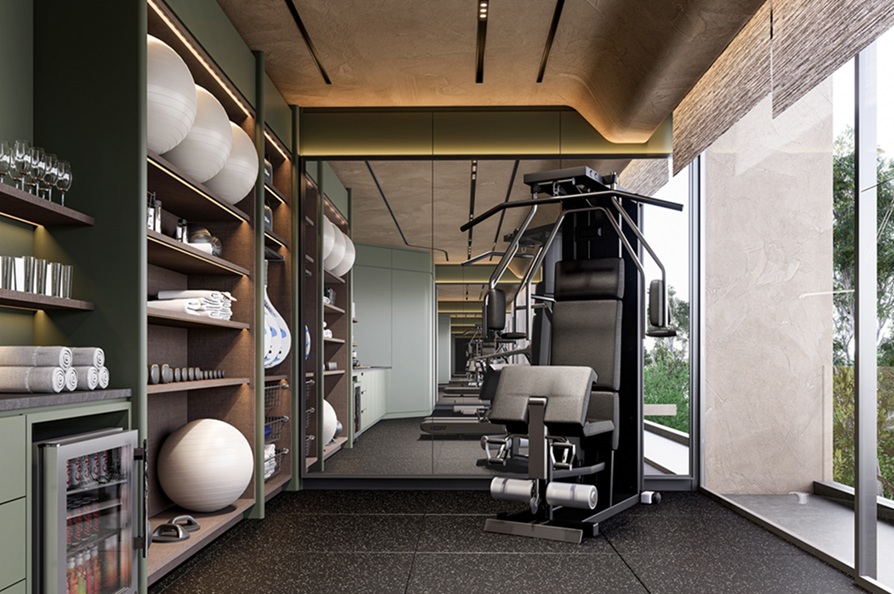 Di ruang gym, unit Daikin Middle Static Pressure Ceiling Mounted Ducted Type 2 HP terintegrasi dengan seamless pada ceiling berupa Box Trox dengan tampilan garis hitam. Hal ini menciptakan suasana yang nyaman saat melakukan aktivitas berat seperti olahraga.