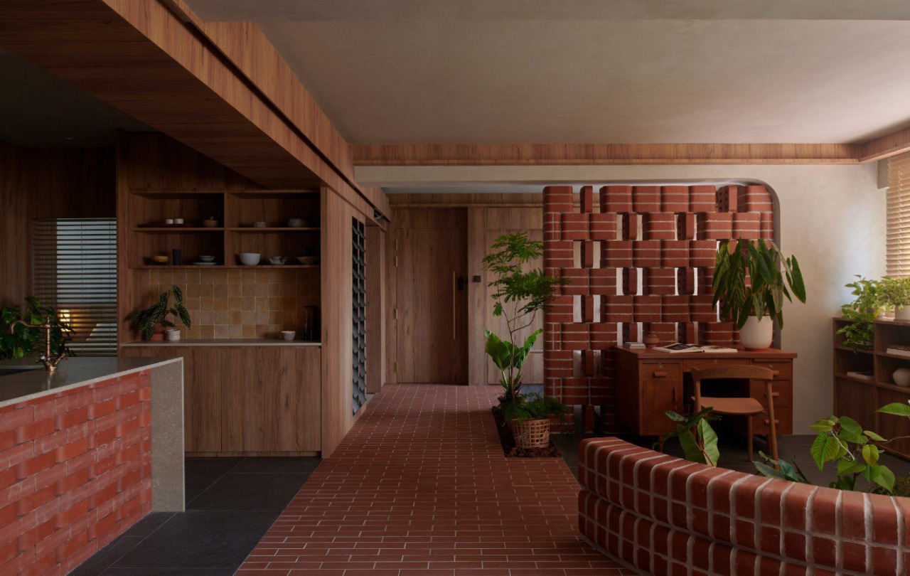 Keunikan utama interior ini terletak pada cara bata double bullnose digunakan secara kreatif dan fungsional. Bata tidak hanya tampil sebagai dinding, tetapi juga membentuk furnitur built in seperti kursi melengkung di area makan dan kerja, dasar kitchen island, serta elemen pemisah ruang.