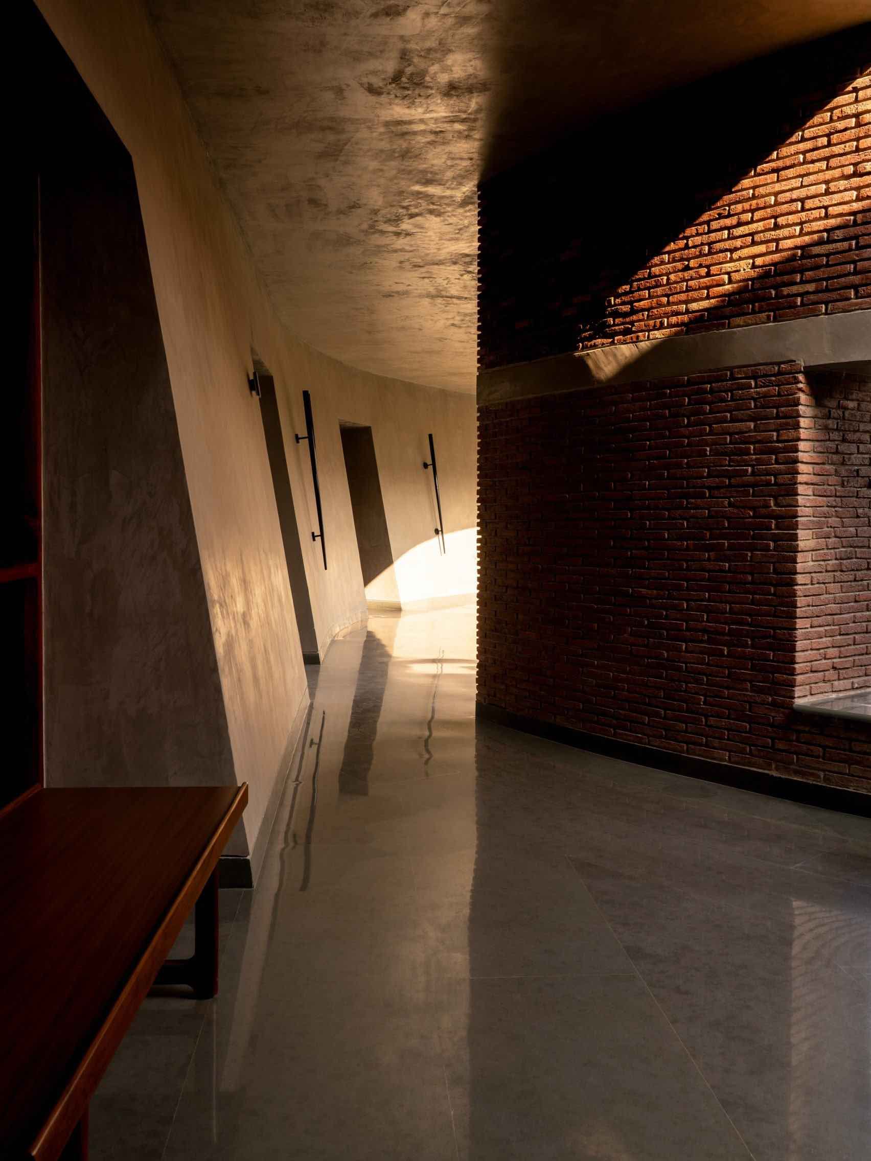 Arsitektur ini dirancang dengan sangat hati-hati agar setiap sudut memungkinkan pengalaman visual yang berbeda, dinding bata menciptakan tekstur kasar, sedangkan interior menghadirkan bahan kayu halus, sofa kulit rendah, dan furnitur bergaya mid-century modern yang sederhana namun elegan. Keseimbangan antara kekasaran dan kelembutan ini memperkuat karakter rumah sebagai ruang meditasi, bukan sekadar tempat tinggal konvensional.
