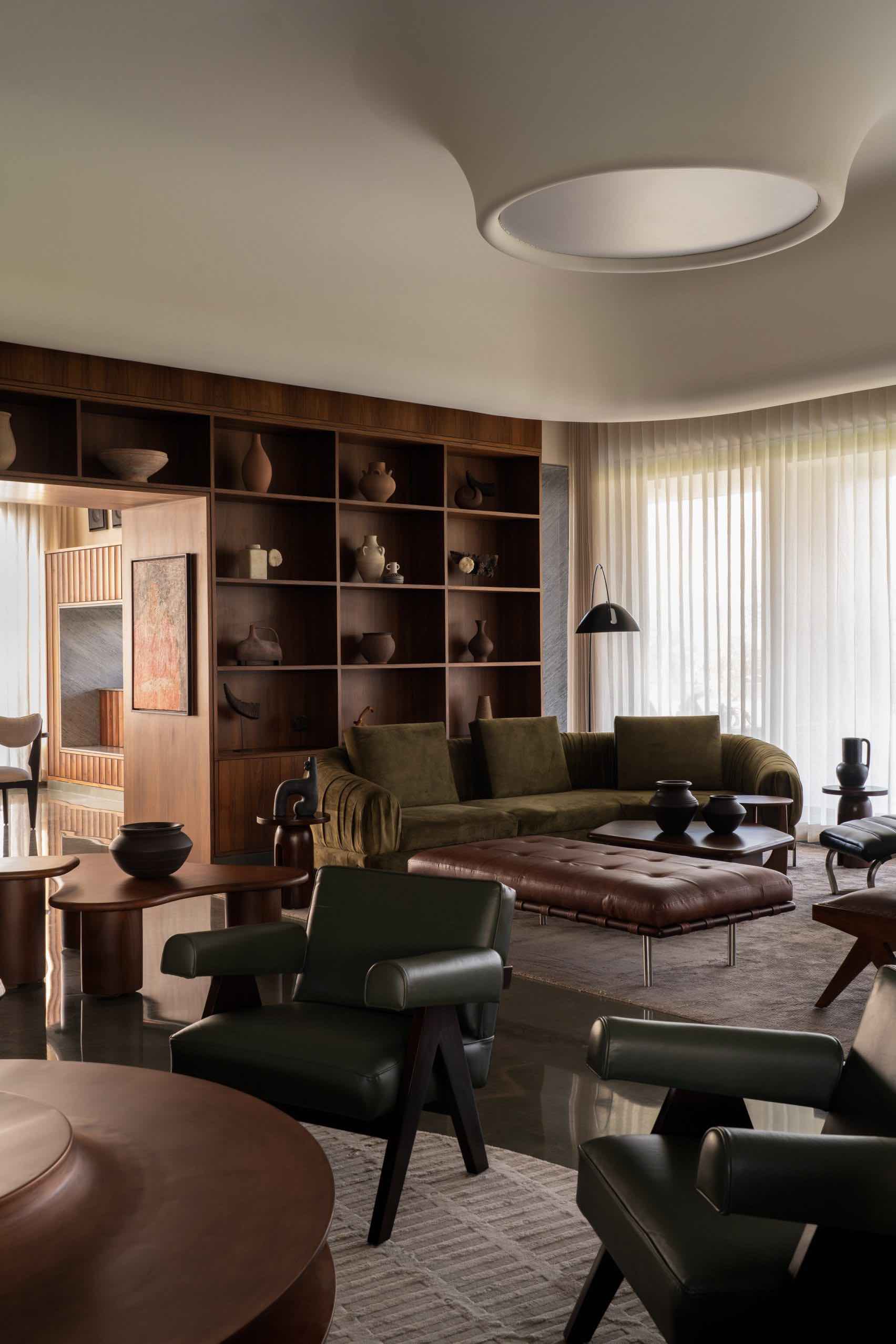 Inti dari desain adalah sebuah courtyard berbentuk lingkaran yang besar. Courtyard ini bukan hanya elemen estetika, ia adalah “void generatif” yang mengatur alur ruang rumah. Lingkaran tersebut mengingatkan pada tradisi arsitektur India klasik, tetapi diinterpretasikan ulang sebagai lanskap skulptural modern dengan air, tanaman, dan area teduh yang menenun sebuah ruang kontemplatif.