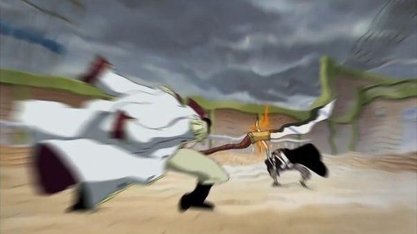 Namun, Whitebeard justru tidak terima dengan peringatan Shanks. Whitebeard menganggap bahwa Shanks terlalu ikut campur dalam urusan keluarganya. Mereka sempat beradu pedang dan bentrokan Haoshoku Haki keduanya berhasil membelah langit.