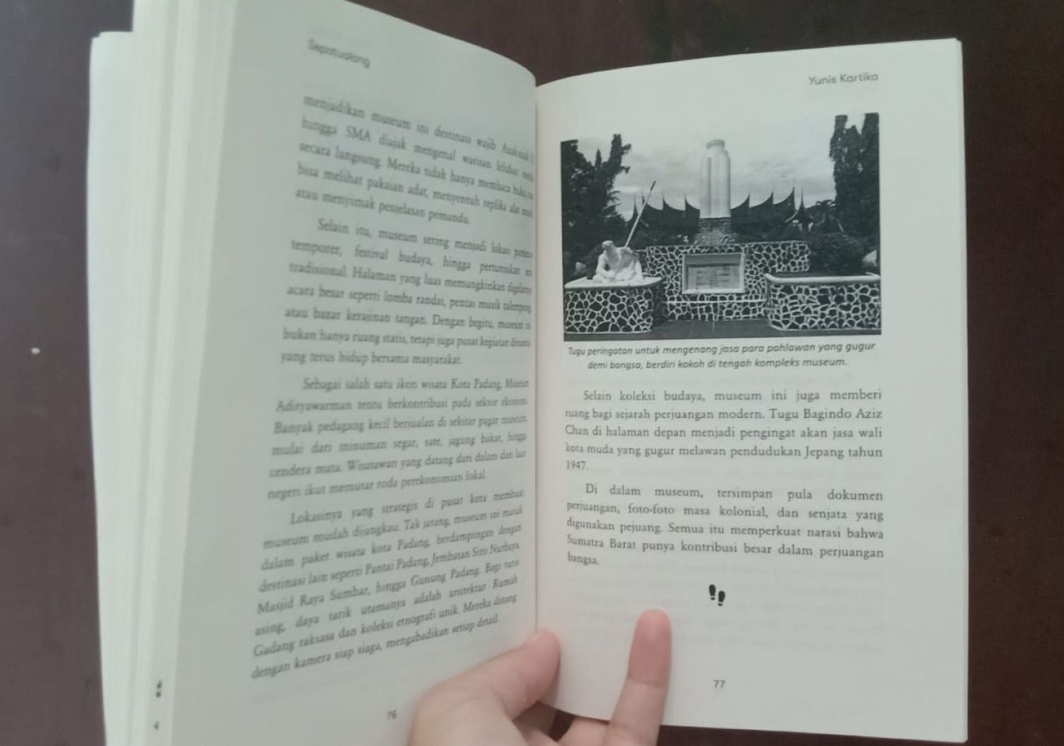 Narasi Yunis yang lembut namun informatif membuat pembaca merasa sedang diajak berjalan langsung di sampingnya—memandang Jam Gadang, menyusuri Ngarai Sianok, merasakan riuh Museum Randang, atau duduk menatap laut di Pantai Air Manis yang membawa legenda Malin Kundang.