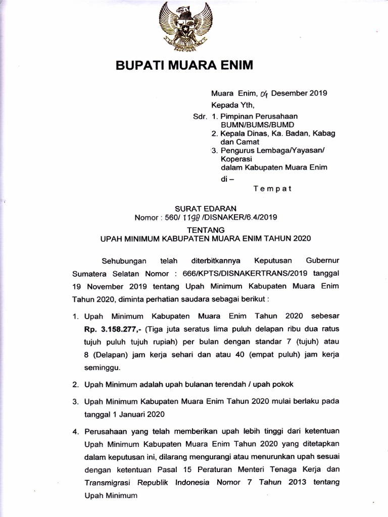 - Upah Minimum Sektoral Kabupaten (UMSK) Muara Enim tahun 2026 sebesar Rp 4.240.899,00