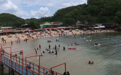 Pengunjung bisa naik ke pulau karang saat air laut surut untuk menikmati panorama laut dari ketinggian. -